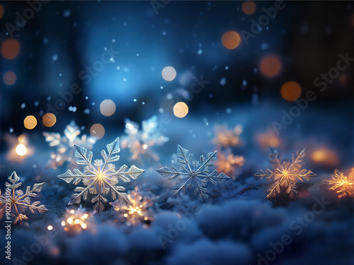 Obraz premium キラキラ輝く雪の結晶と青い夜の背景