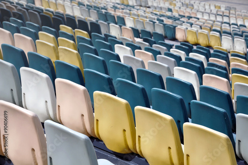 © struvictory, Obraz premium Много разноцветных пластиковых стульев