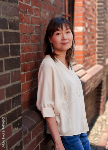 © FUTUREWALKER, Fototapeta premium 煉瓦の壁に寄りかかってこちらを向く女性