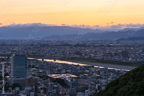Obraz premium 展望台から見た黄昏の薄暗くなった街の眺望(岐阜県)