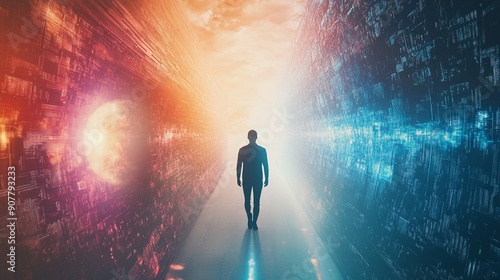 © Nikomiso, Fototapeta premium 分割画面効果:別の世界をつなぐ量子トンネル、未来的な都市景観、コピースペース