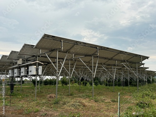 Obraz premium 農地に建てられた太陽光パネル 少し高めの足組で下にはスペースがある