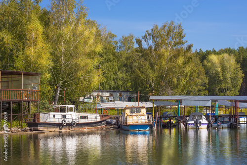 Naklejka premium Лодочная станция на маленькой реке Раздельная. Россия,Новосибирская область,Сибирь,Бердск