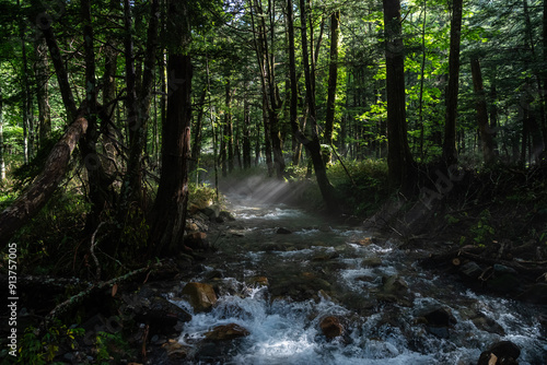 © rai, Obraz premium 森の中の川に差し込む美しい朝の光 上高地