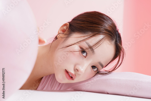 © Hidden Stitch, Fototapeta premium ピンク背景で撮影をした若い女性のキャッチーなビューティー ポートレート