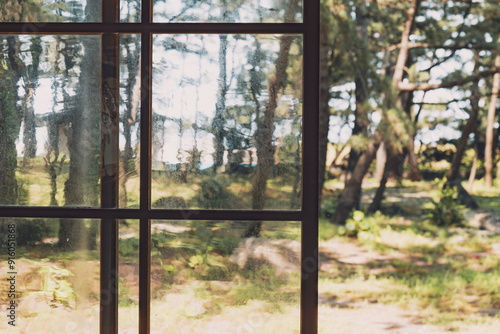 Naklejka premium 木造建築の手作りガラス窓越しから見える風景