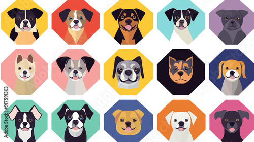© umeno, Fototapeta premium 「【ポップで魅力的な犬アイコン】カラフルな15種類の犬種イラストセット