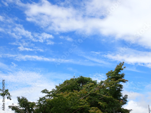© oonoteruaki, Obraz premium 青い夏空に浮かぶ白い雲と生い茂る緑