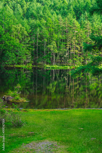 Obraz premium 夏の鮮やかな緑の御射鹿池
