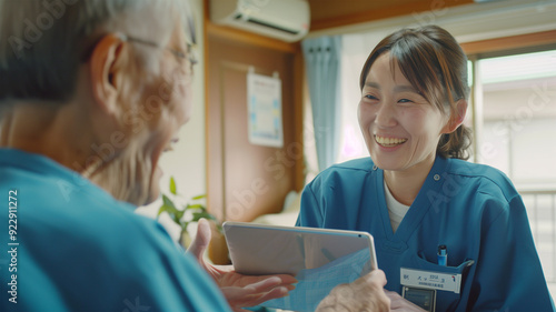 © bephoto, Obraz premium タブレットを使ってケアプランを説明する介護士