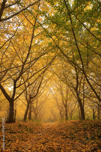 Obraz premium 愛媛県内子町 龍王公園 早朝のイチョウ並木