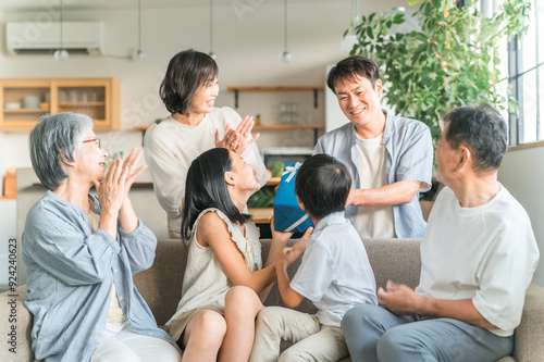 © buritora, Fototapeta premium 家のソファで家族団欒する三世代家族・ファミリー(父の日)