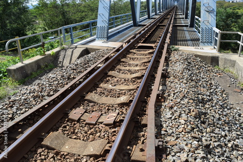 © FRANK, Fototapeta premium 線路(単線)/山形県の庄内地方で羽越本線の線路(単線)を撮影したローカルイメージの写真です。赤川(一級河川)に架かる鉄橋付近で撮影した写真になります。