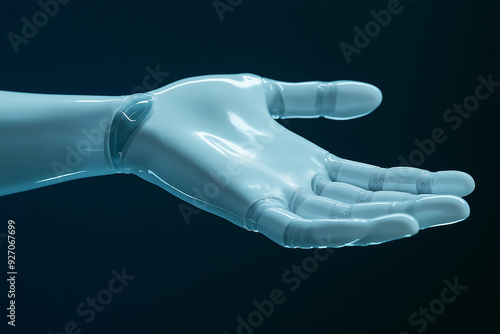 © oyo, Obraz premium アンドロイドの白い手のひら。横向き。暗い青い背景。