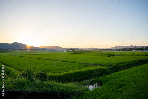 Obraz premium 夕暮れ時の田んぼ風景
