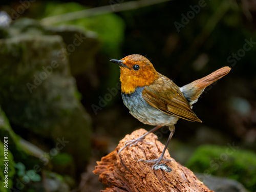 Fototapeta premium 森の中で倒木の上で周りを見渡しているコマドリの雄
