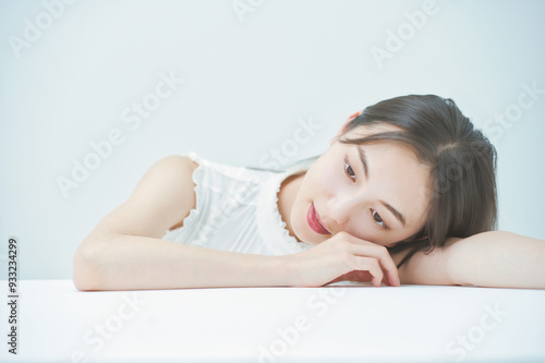 Fototapeta premium 白いテーブルにもたれかかるポーズをする若い女性