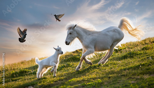 Obraz premium 夢中で遊んでいる仲良しのポニーの子供と子ヤギ