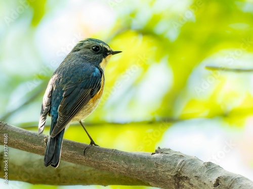 Fototapeta premium 森の中の暗い木陰で枝に留まって周りを見渡しているルリビタキの雄