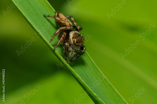 Fototapeta premium 蓮の葉の上で獲物を探すハエトリグモ