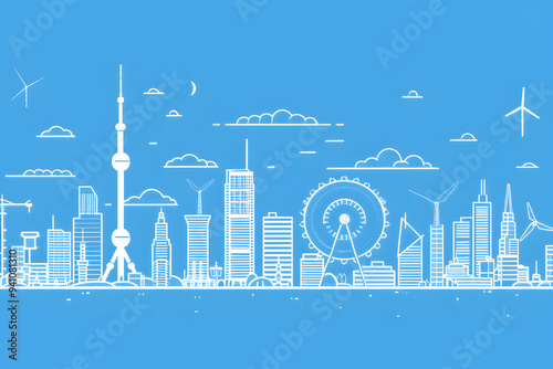 Obraz premium 青空の下の未来都市のビジョンのシンプルイラスト。現代都市デザインと持続可能性
