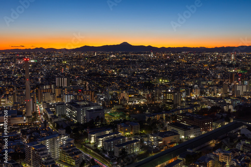 Obraz premium 東京都市風景 夕暮れの恵比寿ガーデンプレイスから富士山方面を望む