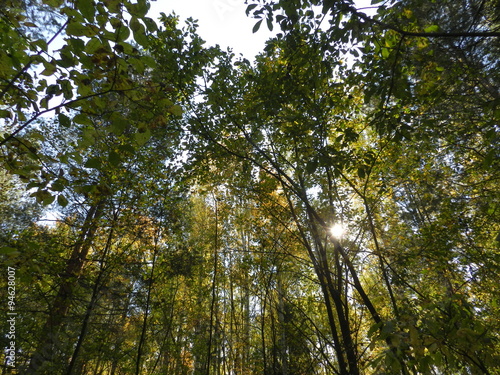 Obraz premium Верхушки деревьев в лесу на фоне неба и проглядывающего солнца в осенний день