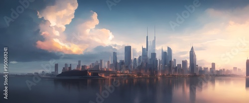 Naklejka premium 雨上がりのような光が注ぐ大都市の風景