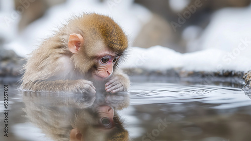 © bephoto, Obraz premium 露天風呂に映る自分を見つめる若い猿
