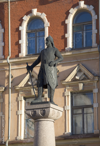 Naklejka premium Скульптура Торгильса Кнутссона на фоне фасада старинного здания. Выборг