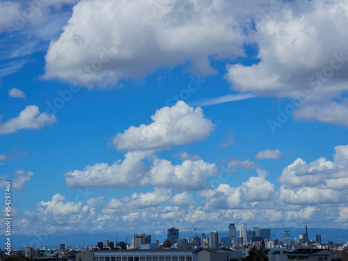 Obraz premium 夏の綺麗な青空と雲の風景と日本の都市の街並みの様子