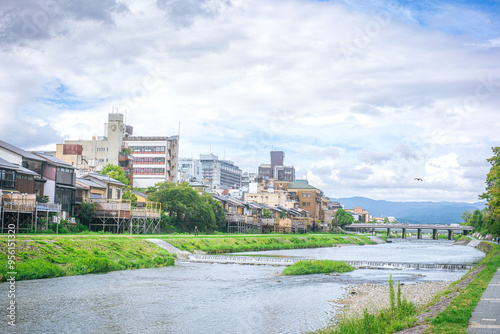 Obraz premium 曇りの鴨川沿いに建ち並ぶ川床の景色