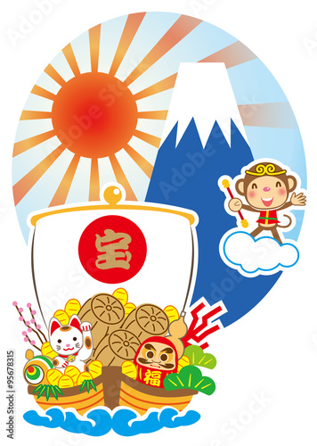 Fototapeta premium 新年 宝舟と孫悟空と富士山