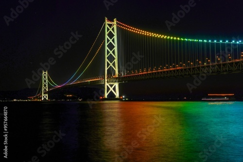Obraz premium レインボーカラーにライトアップされた明石海峡大橋の情景