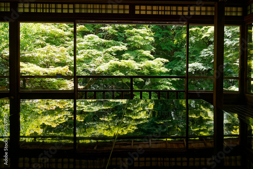 © Keisuke.W, Naklejka premium 瑠璃光院のテーブルに反射する新緑
