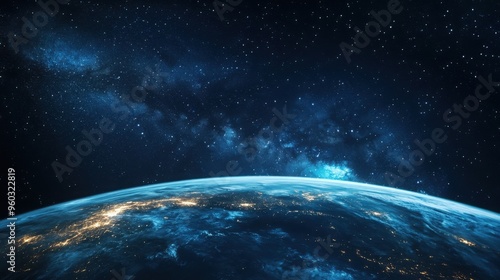 Fototapeta premium ภาพกลางคืนอันสวยงามของโลกจากอวกาศ พร้อมดวงดาวและกาแล็กซีบนท้องฟ้า และแสงไฟในเมืองที่ส่องสว่างบนขอบฟ้าในยามพลบค่ำหรือรุ่งเช้า