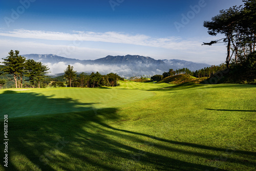 © Cokr, Obraz premium 구름이 산중턱에 걸려있는 풍경이 보이는 산위의 골프장.