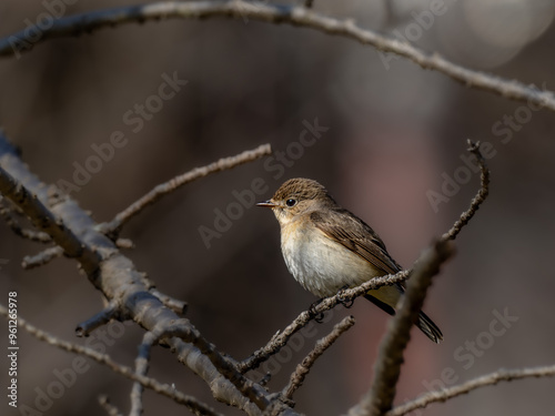 Naklejka premium 森の中で枝に留まって周りを見渡しているニシオジロビタキの雌