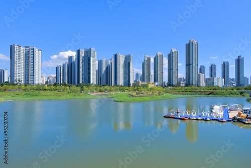 Naklejka premium 인천시 청라국제도시와 청라호수의 여름