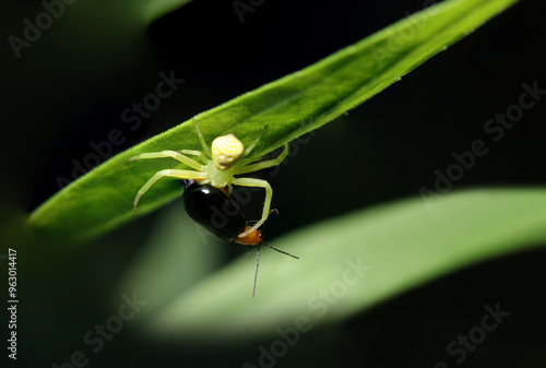 Fototapeta premium 黒と橙色のクロウリハムシを捕食する無紋型のコハナグモ(自然光+ストロボ・マクロ接写)