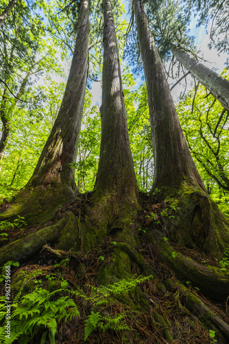© pespiero, Obraz premium 日本 長野県長野市にある戸隠神社の奥社の杉並木の参道 下から見上げた巨大な杉の木