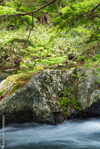 © pespiero, Naklejka premium 日本 長野県松本市安曇にある山岳景勝地の上高地 穂高神社奥宮神域の明神池の二之池から流れ出す渓流