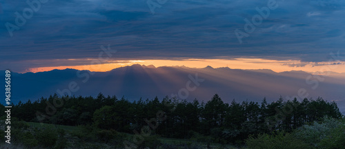 © pespiero, Fototapeta premium 日本 長野県岡谷市と塩尻市の境にある高ボッチ山の高ボッチ高原から見える夕陽の光芒と夕焼け空
