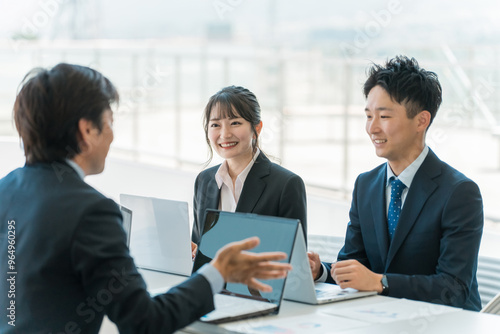 Fototapeta premium 企業のオフィスで笑顔で会議・ミーティング・商談をするビジネスマン・ビジネスウーマン