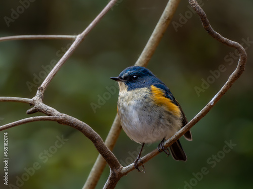 Fototapeta premium 森の中の木陰で枝に留まって周りを見渡しているルリビタキの雄