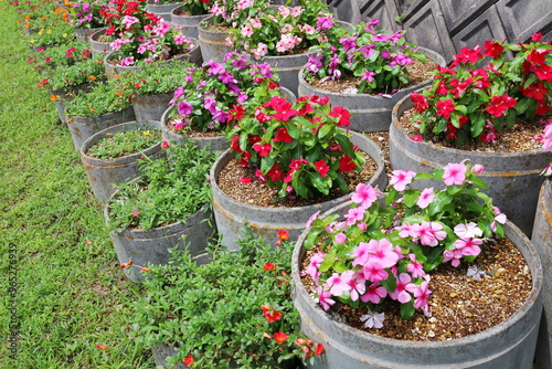 © 亜矢子 広畑, Fototapeta premium 鉢に植えられたニチニチソウの花壇
