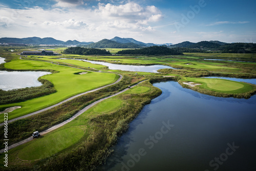 © Cokr, Obraz premium 링스코스 스타일의 골프장을 드론으로 바라보다.