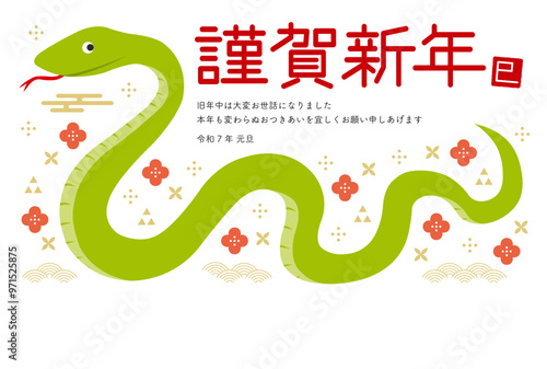 © yugashi, Fototapeta premium 横向きの蛇と和柄のイラストの年賀状_謹賀新年_横型_白