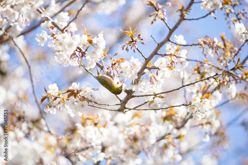Fototapeta premium 青空に映える満開の桜の花に囲まれたメジロ