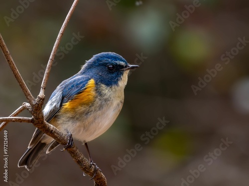 Naklejka premium 森の中の木陰で枝に留まって周りを見渡しているルリビタキの雄